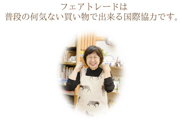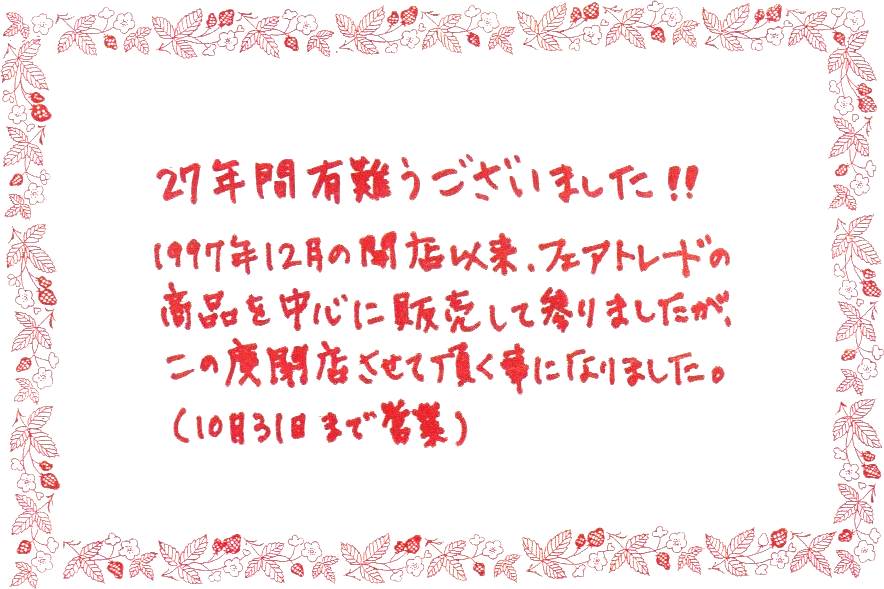 今日は、お店はお休み。シャッターを閉め店内にいます。27年間頑張ってくれたテーブルに頬杖をつき、この道をふり返っています。連雀通り沿いの木造二階建ての家をお借りしてスタートしたフェアトレードのお店。昼食時にお出しするカレー作りのお手伝いが出来ればと軽い気持ちで一歩を踏み入れました。当時は私共の考え方を前面に出さず「めずらしい物」のお店として存在していました。10年が過ぎた頃、現在の場所に移りました。ここは駐輪場にも困らずゆったりしていて気持が楽でした。お客様の中には市民活動をされている方も多く、情報交換の場としてもここをご利用下さって嬉しく思っていました。私も自分の立場を忘れてしまうことも多々ありました。